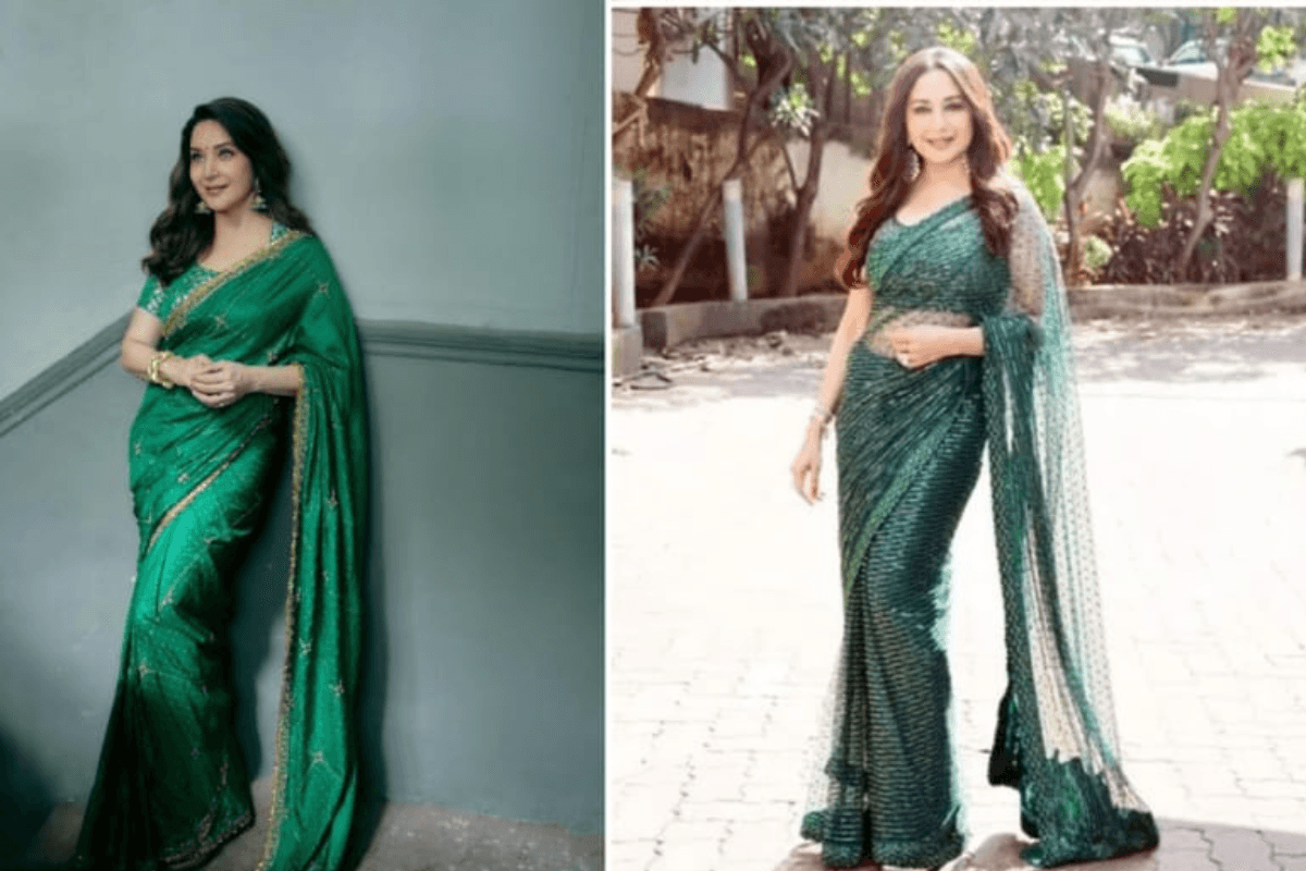 मधुरी दीक्षित की यह शिफॉन और नेट साड़ी बेहद एलिगेंट और क्लासिक लुक देती है. हल्के फैब्रिक और सिंपल डिजाइन के साथ यह साड़ी सावन के खास मौके के लिए परफेक्ट है.