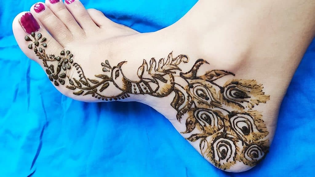 पैस्ली और मोर की डिजाइन पैरों के लिए बहुत सुंदर और डिटेल्ड लुक देती है, इस डिज़ाइन में पारंपरिक पैस्ली पैटर्न और मोर की आकृतियां होती हैं, जो दुल्हन के पैरों पर बहुत आकर्षक दिखाई देती हैं, यह डिजाइन भारतीय शादियों में खासतौर पर पसंद की जाती है, इस डीज़ाइन को आपके पैरों की अंगुलियों, पंजे और ऐड़ी के आसपास बहुत ही खूबसूरती से सजाया जा सकता है.