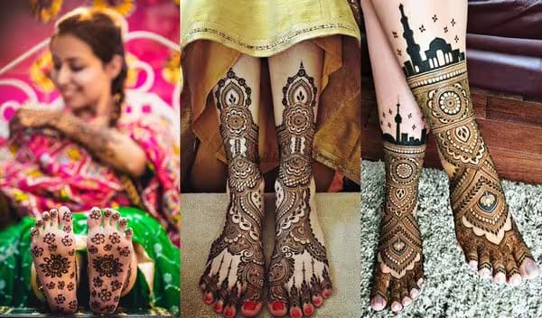 ब्राइडल ट्रैडिशनल पैरों की मेहंदी डीज़ाइन में बहुत सारी धार्मिक और सांस्कृतिक तत्वों का समावेश होता है। इसमें दुल्हन के पैरों के अंगूठे और पंजों पर पारंपरिक पैटर्न, जैसे की सितारे, फूल और चक्र होते हैं, इसके अलावा, दुल्हन के पैरों में रंगीन गोटा पट्टी, माणिक, या चूड़ियों से सजावट भी की जा सकती है, जिससे पैरों की मेहंदी और भी रॉयल नजर आती है.