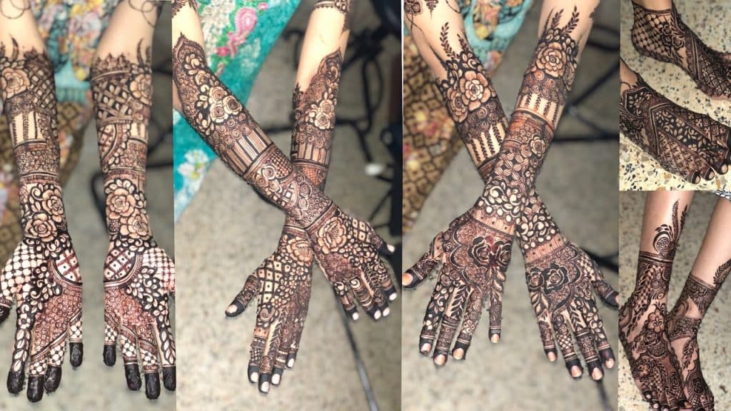 अगर आप एक पारंपरिक और रॉयल लुक चाहती हैं, तो फ्लोरल डिज़ाइन सबसे बेहतरीन विकल्प हो सकता है, इस डिज़ाइन में हाथों पर बड़े-बड़े और छोटे-छोटे फूलों के पैटर्न बनाए जाते हैं, जो बहुत ही आकर्षक दिखते हैं, यह डिज़ाइन दुल्हन को एक राजकुमारी जैसा एहसास दिलाता है, आप इस डिज़ाइन में अपने मनपसंद फूलों का चयन कर सकती हैं, जैसे गुलाब, कमल, और लिली.