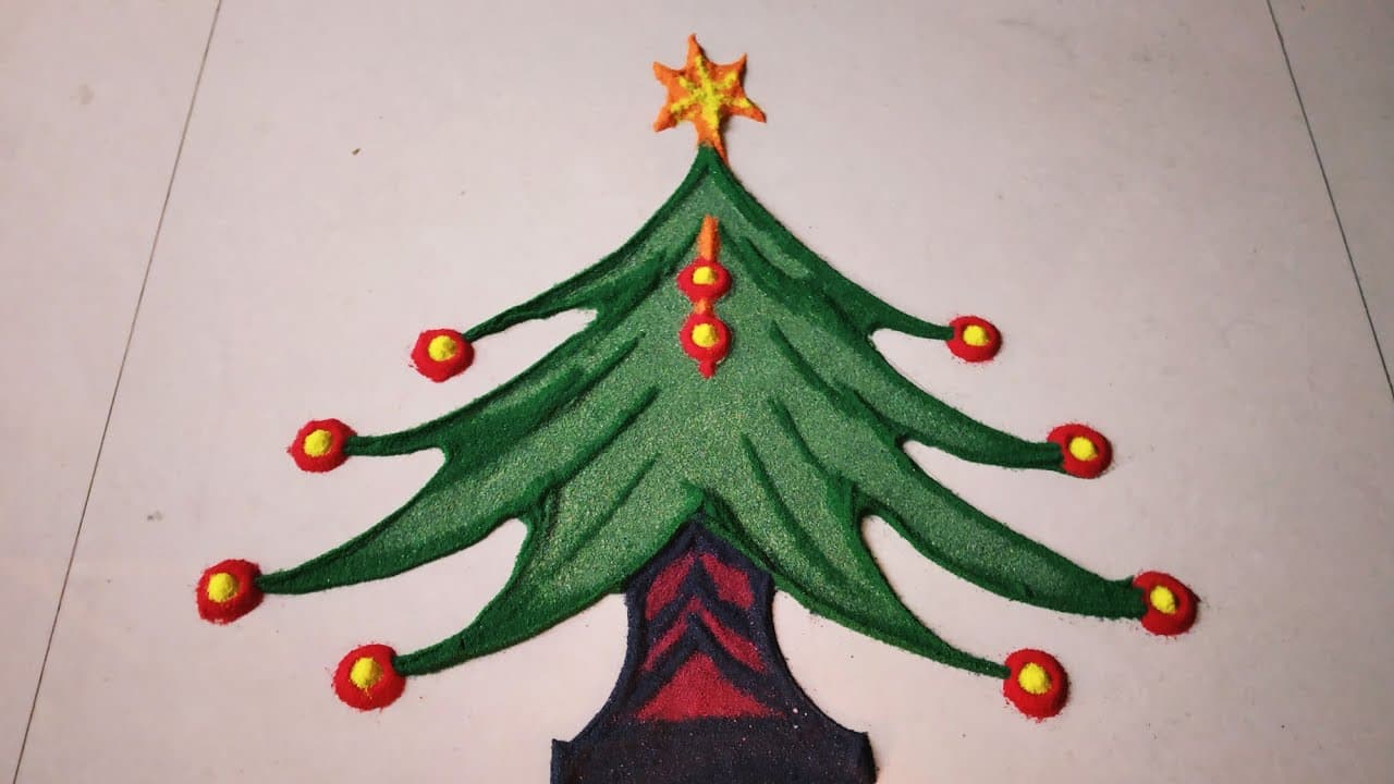 क्रिसमस ट्री का डिज़ाइन सबसे लोकप्रिय और खास होता है, इसे बनाने के लिए हरे रंग से एक ट्राइएंगल आकार बनाएं, जो क्रिसमस ट्री को दर्शाता है, फिर, इसे रंगीन डॉट्स या सितारों से सजाएं, नीचे के हिस्से में उपहार या छोटे-बड़े बक्से बनाए जा सकते हैं, यह डिज़ाइन हर किसी का ध्यान आकर्षित करेगा और आपके घर को क्रिसमस की भावना से भर देगा.