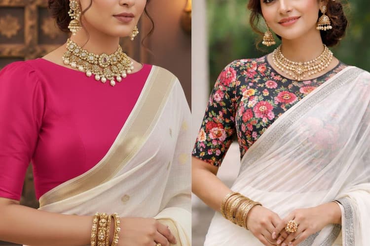 Contrast Blouse Ideas With White Saree: खूबसूरत सफेद साड़ी के साथ हर बार पुराने मैचिंग ब्लाउज पहनकर बोर हो चुकी हैं और अपने लुक में नया ट्विस्ट जोड़ना चाहती हैं तो ये आर्टिकल आपके काम का है. आप सफेद साड़ी को अलग-अलग रंग के ब्लाउज के साथ स्टाइल कर सकती हैं. सफेद साड़ी के साथ अलग-अलग रंग के ब्लाउज ट्राई करके आप अपने लुक को ग्लैमरस और आकर्षक बना सकती हैं.