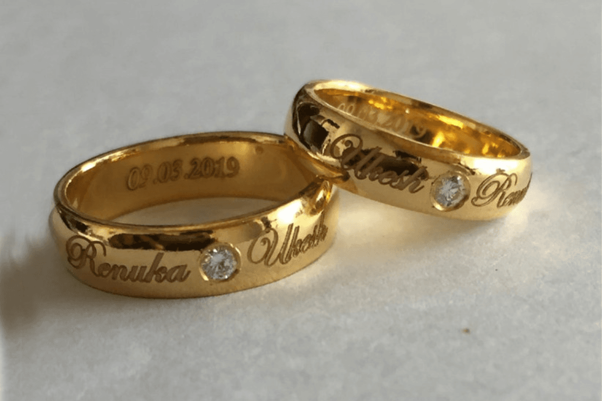 अगर आप अपनी एंगेजमेंट के लिए पर्सनलाइज्ड रिंग चाहते हैं, तो इस तरह के रिंग आपके लिए परफेक्ट चॉइस हो सकते हैं. इसमें एक-दूसरे के नाम और सगाई की तारीख को लिखा जाता है, जो इसकी खूबसूरती को और भी बढ़ा देता है. यह रिंग आपके प्यार और वादे की एक अनोखी निशानी होगी.