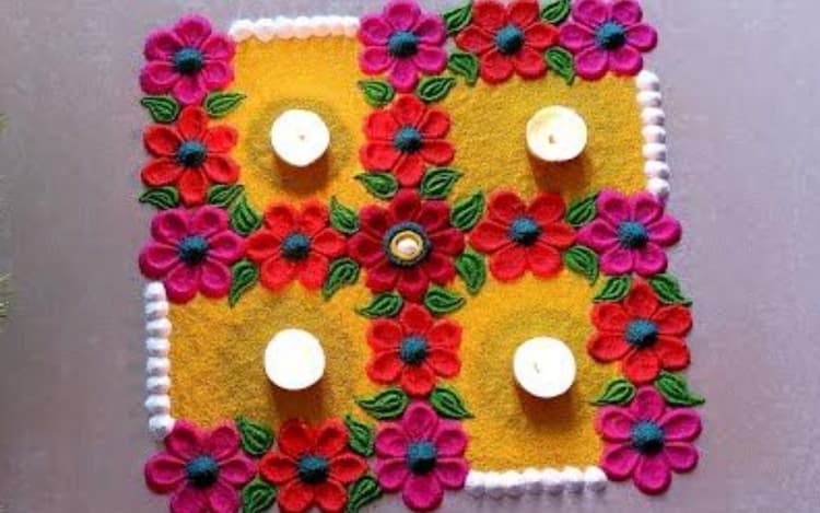 बाजार में रंग-बिरंगी रंगोली पाउडर आसानी से मिल जाता है. आप चाहें तो चावल के आटे, हल्दी और गेरू आदि के प्रयोग करके भी सुंदर रंगोली बना सकती हैं.
