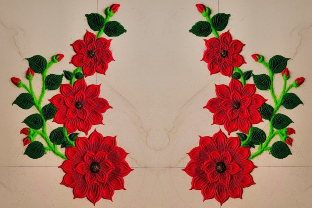 2. रंगों का चयन: रंगोली बनाने के लिए रंगों का चयन करना महत्वपूर्ण है. आप सफेद, पीला, गुलाबी, हरा जैसे रंगों का उपयोग कर सकते हैं जो इस त्यौहार के लिए शुभ माने जाते हैं.