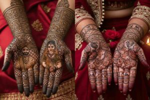 शादी के दिन दुल्हन के हाथों पर लगाई जाने वाली खास मेहंदी के लिए आप इन डिजाइन को फॉलो कर सकती हैं. इस डिजाइन में दिल, दूल्हा-दुल्हन की झलक और पारंपरिक पैटर्न बनाए जाते हैं, जो रचने के बाद बहुत सुंदर दिखते हैं.