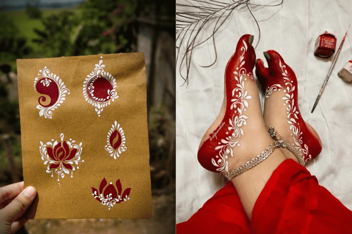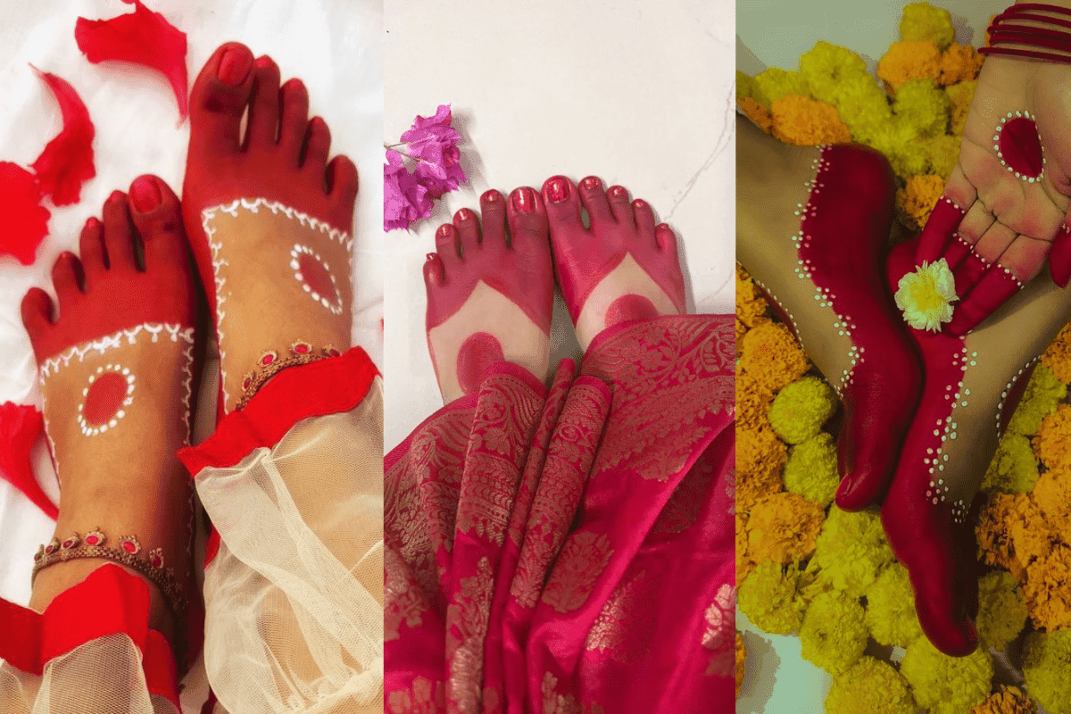 इस डिजाइन में पैरों को लाल आलता से सजाया जाता है और बीच-बीच में सफेद बिन्दु या डॉट्स बनाए जाते हैं. यह बंगाली परंपरा से जुड़ा हुआ डिजाइन है और खासकर दुर्गा पूजा और नवरात्रि में बहुत ट्रेंड करता है.