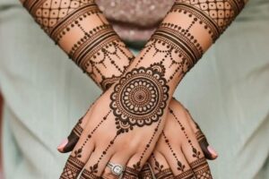 टिक्की + जाली कॉम्बो (Tikki with Jaali Combo): हथेली के बीच में बड़ा गोल फूल या टिक्की, और कलाई तक पतली जाली. जाली में बीच में छोटे डॉट्स होते हैं.यह आपको माॅर्डन लुक देता है.