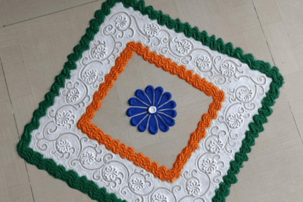 इस रंगोली के लिए आपको केवल तीन रंगों की जरूरत होगी: नारंगी, सफेद और हरा. रंगोली की जगह पर सबसे पहले सफेद रंग से एक बड़ा चौकोर डिज़ाइन बनाएं. फिर इसके चारों ओर नारंगी और हरे रंग के पैटर्न बनाएं, जैसे कि छोटे-छोटे त्रिकोण या गोल आकार. यह डिज़ाइन न केवल सरल है, बल्कि भारतीय ध्वज के रंगों को भी दर्शाता है.