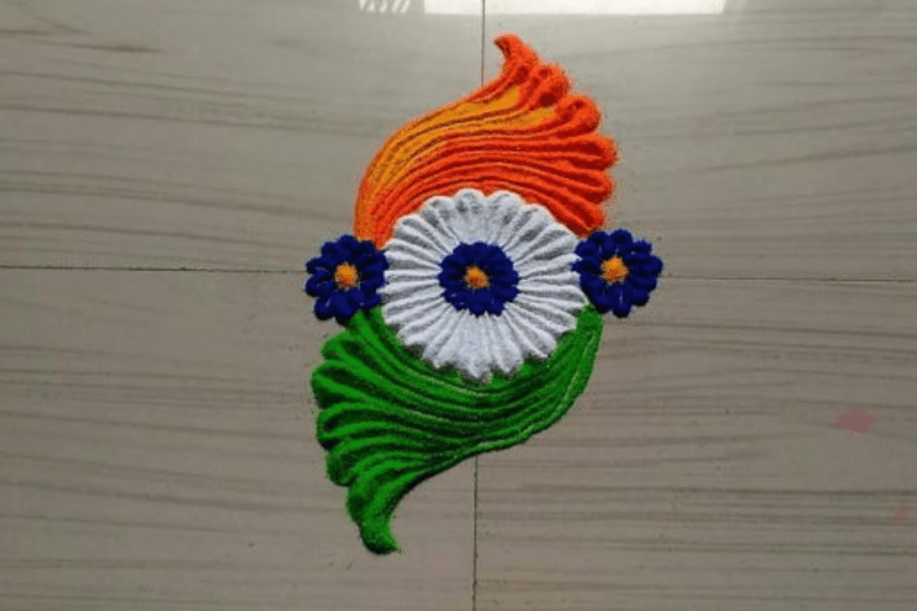 यह रंगोली डिजाइन भी बहुत आसान है. सबसे पहले रंगोली की जगह को सफेद रंग से भरें. फिर तिरंगे के रंगों का उपयोग करके बड़े और छोटे फूल बनाएं. नारंगी और हरे रंग की पत्तियों से फूलों को सजाएं. यह डिजाइन स्वतंत्रता दिवस की खुशियों को दर्शाता है.