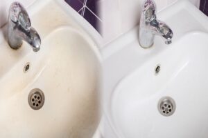 - बेसिन पर बेकिंग सोडा छिड़कें.