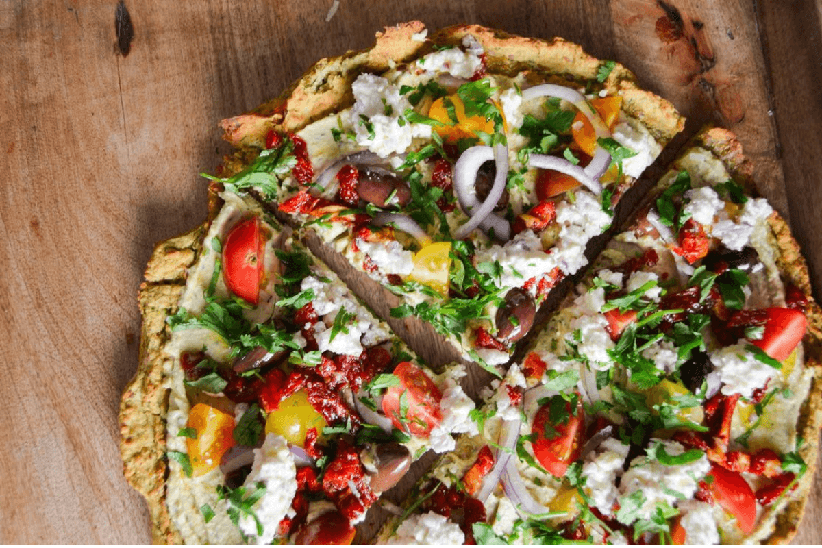 - पिज्जा बेस को जैतून के तेल से ब्रश करें और ह्यूमस या पिज्जा सॉस फैलाएं.