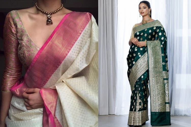 बनारसी साड़ियां अपने जटिल पुष्प और पत्ते पैटर्न के लिए प्रसिद्ध हैं, जो अक्सर मुगल कला से प्रेरित होती हैं. उनकी नाजुक, विस्तृत सीमाएं हैं, जो अधिक जटिल और नाजुक सौंदर्य को दर्शाती हैं. बनारसी साड़ियां बहुमुखी हैं और औपचारिक और अनौपचारिक दोनों आयोजनों के लिए उपयुक्त हैं. वे त्योहारों, समारोहों और अन्य उत्सव के अवसरों के लिए एक लोकप्रिय विकल्प हैं.