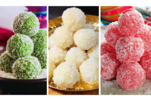 आज हम आपके लिए लेकर आए हैं तीन खास रेसिपी – रोज कोकोनट लड्डू, पान कोकोनट लड्डू और कोकोनट मावा लड्डू. इन्हें बनाना आसान है और ये स्वाद में भी लाजवाब लगते है.