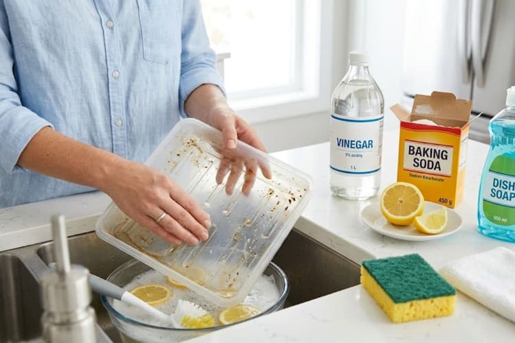 एक कटोरी में सफेद सिरका और पानी बराबर मात्रा में मिलाएं. इस मिश्रण में ट्रे को 15–20 मिनट भिगोकर रखें. फिर स्पंज से रगड़कर धो लें. दाग और बदबू दोनों साफ हो जाएंगे.