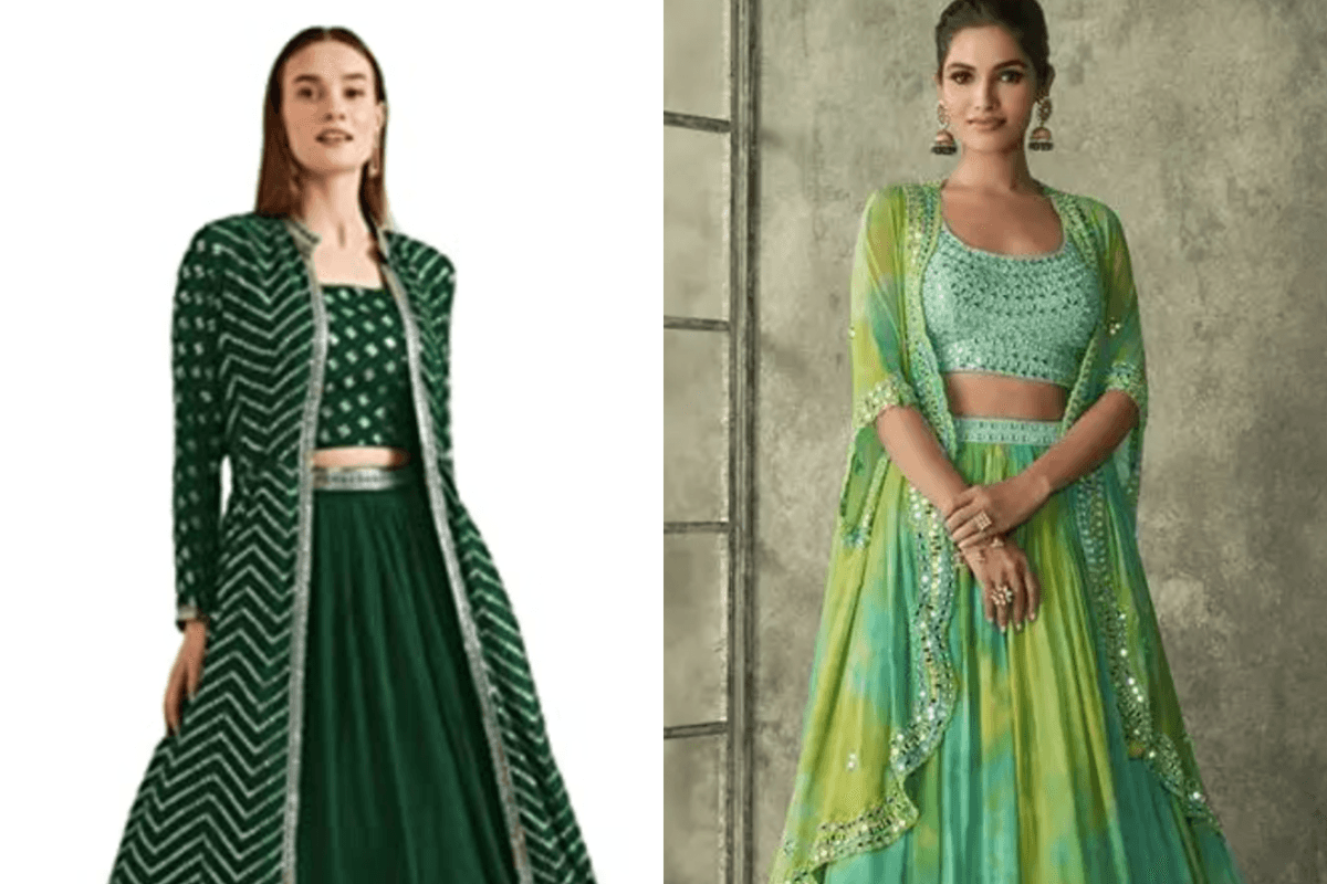 अगर आप कुछ हटकर और फ्यूजन स्टाइल पहनना चाहती हैं, तो जैकेट स्टाइल ग्रीन लहंगा ट्राई करें. इस तरह का आउटफिट ट्रेंड में है और बहुत ही ग्रेसफुल भी लगता है. जैकेट पर थ्रेड वर्क या सीक्विन डिटेल इसे और भी खूबसूरत बनाते हैं.