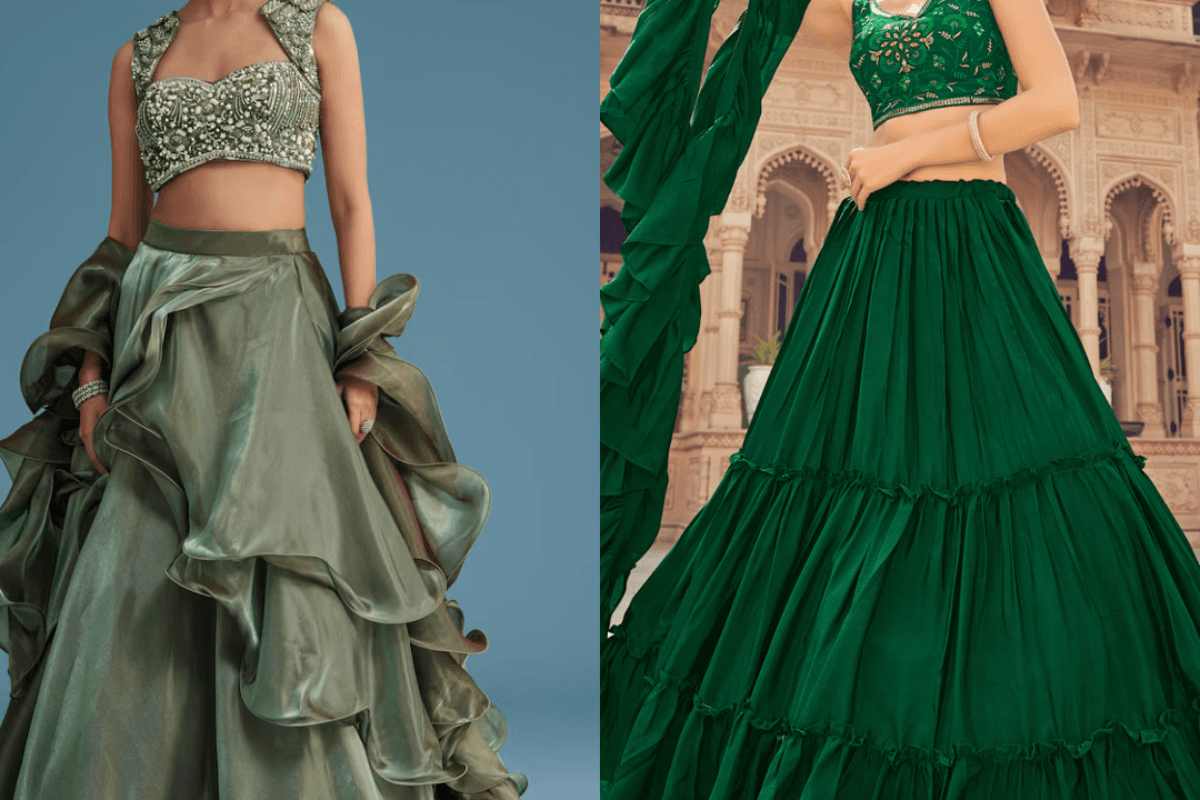 अगर आप कॉलेज गोइंग हैं या यंग गर्ल हैं, तो रफल स्टाइल ग्रीन लहंगा बहुत ही ट्रेंडी ऑप्शन है. ये लहंगा दिखने में मॉडर्न होता है लेकिन त्यौहार के मूड को भी पूरा करता है. हल्की सी मेकअप और फ्रेश हेयरस्टाइल के साथ आप बिल्कुल फैशन आइकन लगेंगी.
