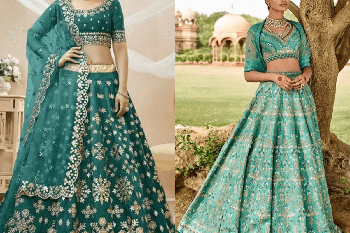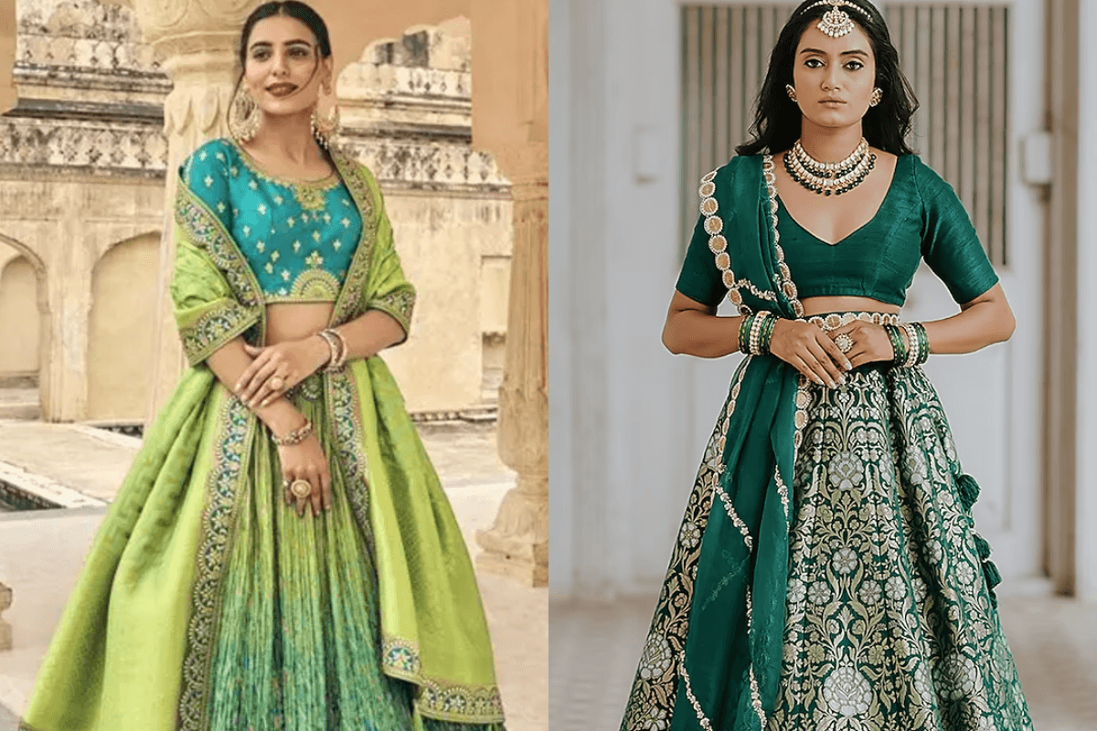 अगर आप रॉयल और क्लासिक लुक चाहती हैं, तो बनारसी ग्रीन लहंगा परफेक्ट रहेगा. गोल्डन जरी वर्क और सिल्क की चमक इस लहंगे को बेहद एलिगेंट बनाते हैं. इसे मैचिंग चोली और हैवी दुपट्टे के साथ पहनें. साथ में ट्रेडिशनल ज्वेलरी आपको पूरा शाही टच देगी.
