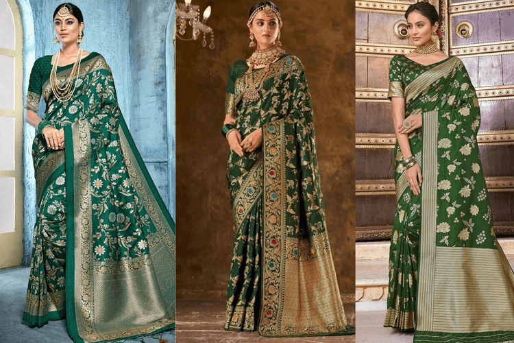 1. Green Banarasi Saree – डार्क ग्रीन बनारसी साड़ी
