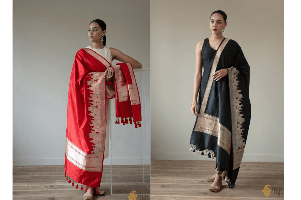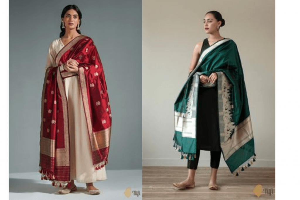 अगर आप कुछ रॉयल और क्लासिक लुक चाहती हैं, तो बनारसी दुपट्टा आपके लिए बेस्ट ऑप्शन है. बनारसी दुपट्टे में खूबसूरत गोल्डन और सिल्वर जरी का काम होता है, जो इसे बहुत ही खास बनाता है. इसे आप प्लेन कुर्ता-पायजामा या अनारकली सूट के साथ कैरी कर सकती हैं. यह दुपट्टा आपको एक रिच और एलिगेंट लुक देगा.