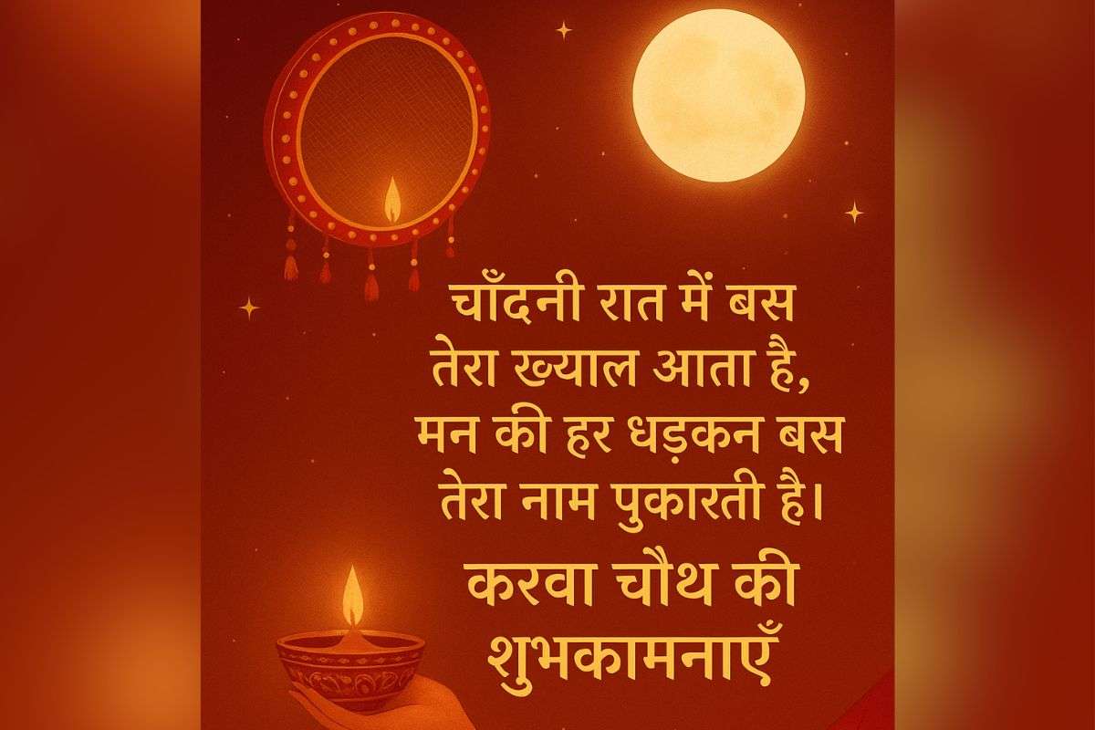 Happy Karwa Chauth 2025 Wishes Live: आज 10 अक्टूबर को करवा चौथ का पर्व धूमधाम और उल्लास के साथ मनाया जा रहा है. करवा चौथ हिंदू धर्म का एक पवित्र त्योहार है, जो प्यार, समर्पण और विश्वास का प्रतीक माना जाता है. इस दिन महिलाएं पूरे दिन व्रत रखकर अपने पति की लंबी उम्र, स्वास्थ्य और खुशहाली की कामना करती हैं. ये पर्व पति-पत्नी के रिश्तों में स्नेह और अपनापन बढ़ाने का अवसर देता है. महिलाएं इस दिन सजती है, हाथों में मेहंदी लगाती हैं और इस दिन को खास बनाने के लिए विशेष तैयारियां भी करती हैं. ऐसे में इस करवा चौथ, आप अपने प्रियजन के साथ मिलकर प्यार और खुशियों का जश्न मनाइए और यहां से भेजें सुंदर शुभकामनाओं का संदेश.