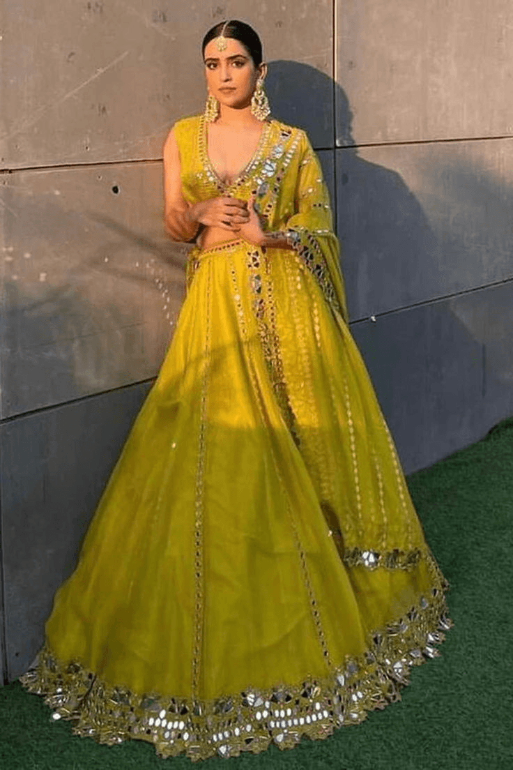 जो महिलाएं ट्रेंड को फॉलो करना पसंद करती हैं उनके लिए पेस्टल ग्रीन मिरर वर्क लहंगा एकदम परफेक्ट चॉइस है. यह पार्टी फंक्शन में परफेक्ट लुक देता है.