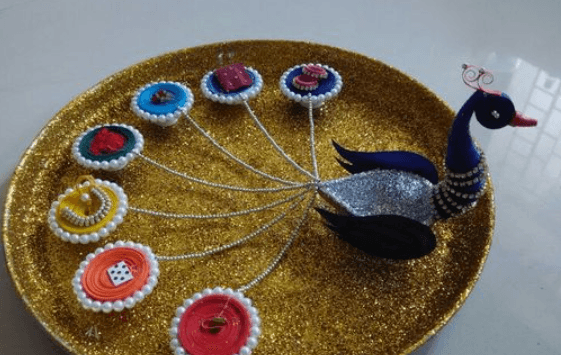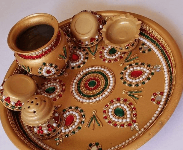 आप अपनी पूजा की थाली को छोटे-छोटे दिये और कलश से भी सजा सकती हैं अगर आप चाहती हैं कि थाली और आकर्षक लगे तो आप इसे मोती और लेस से भी सजा सकती हैं.