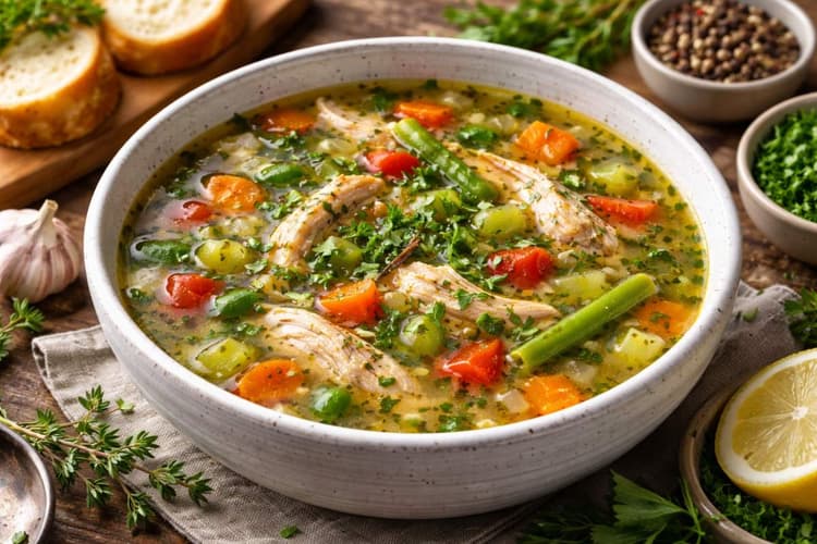 Herb Chicken Soup: सर्दियों के इन दिनों में अगर आप एक हेल्दी और लाइट डिनर करना चाहते हैं, तो हर्ब चिकन सूप आपके लिए एक बेहतरीन चॉइस है. यह सूप सिर्फ स्वाद में टेस्टी नहीं होती बल्कि सेहत के लिए भी काफी ज्यादा फायदेमंद होती है. इसकी हर एक चम्मच में आपको प्रोटीन, विटामिन्स और हर्ब्स का न्यूट्रिशन मिलता है, जो आपके शरीर को अंदर से गर्म रखता है और डाइजेशन को भी आसान बनाता है. जब आप इसे घर पर बनाते हैं तो इसके लाइट और खुशबूदार फ्लेवर से पूरे घर में एक फ्रेशनेस से भरा माहौल तैयार हो जाता है. अगर आप पूरे दिन काम करने के बाद रिलैक्स करना चाहते हैं तो भी आपके लिए हर्ब चिकन सूप एक बेहतरीन ऑप्शन है. तो चलिए जानते हैं इस हेल्दी सूप को बनाने की आसान रेसिपी.