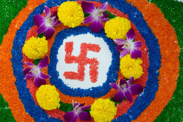इस आसान स्वास्तिक वाली रंगोली को बनाने के लिए चावल के दानों को नीले और नारंगी रंग और हरे रंग से रंगा गया है, जिसके ऊपर फूलों से सजाया गया है. ये गोल रंगोली आसान और सुंदर लगेंगे.