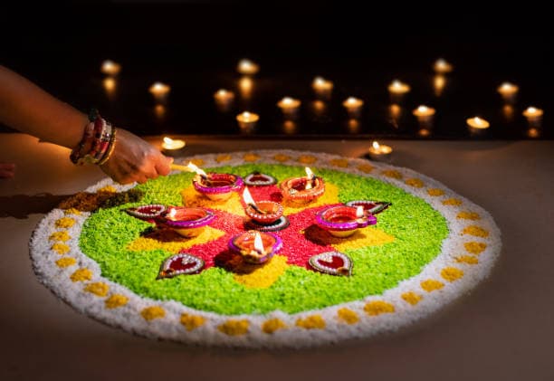 इस रंगोली में हरे रंग को हाइलाइट किया गया है. जिसे जलते दीयों से खूबसूरक अंदाज में सजाया गया है, जो बेहद सुंदर नजर आ रहा, आप भी इसे जरूर ट्राइ करें.