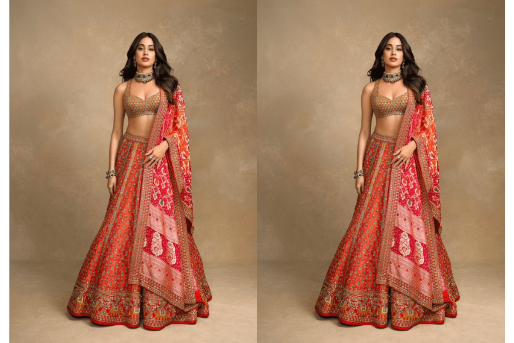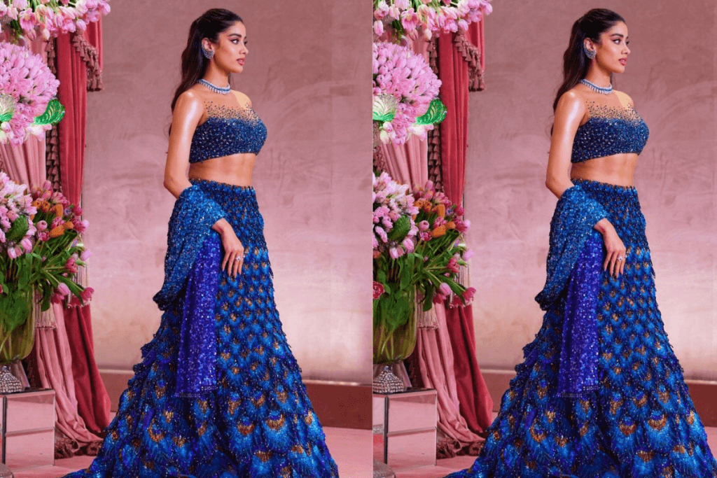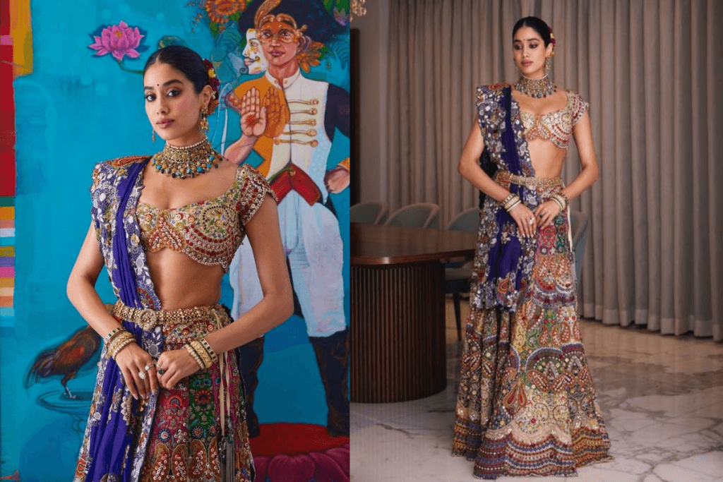 जाह्नवी ने ट्रेडिशनल साड़ी और लहंगे का फ्यूजन लुक क्रिएट किया, जो बेहद खास है. इस लहंगे में साड़ी की प्लीट्स और लहंगे की फ्लेयर का परफेक्ट कॉम्बिनेशन है. जाह्नवी ने इसे एम्बेलिश्ड ब्लाउज और स्लीक बेल्ट के साथ स्टाइल किया. यह लुक संगीत या मेहंदी के फंक्शन के लिए एकदम सही है.