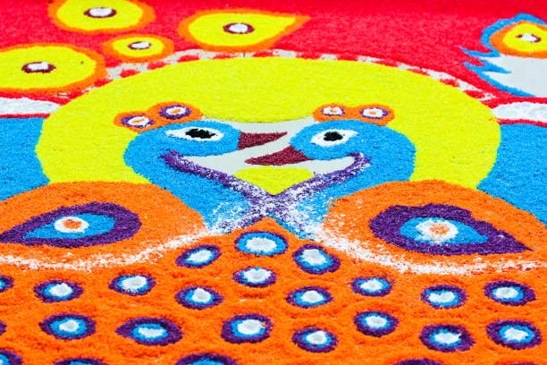 इस जन्माष्टमी पर आप अपने घर या मंदिर में ये मोर डिजाइन वाली गोल रंगोली बना सकते हैं. इस प्रकार की रंगोली की सुंदरता ही कुछ और होती है, ये देखने में भव्य और सबके मन को मोहने वाली होती है. इस प्रकार की रंगोली में पारंपरिक डिजाइन का भी इस्तेमाल किया जाता है.