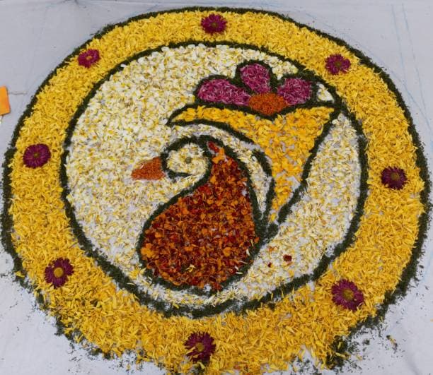 आप चाहे तो इस जन्माष्टमी पर फूलों का इस्तेमाल करके मोर डिजाइन वाली रंगोली बना सकते हैं, इस प्रकार की रंगोली बनाने में आसान होती है और देखने में भी अलग और बहुत सुंदर होती है.