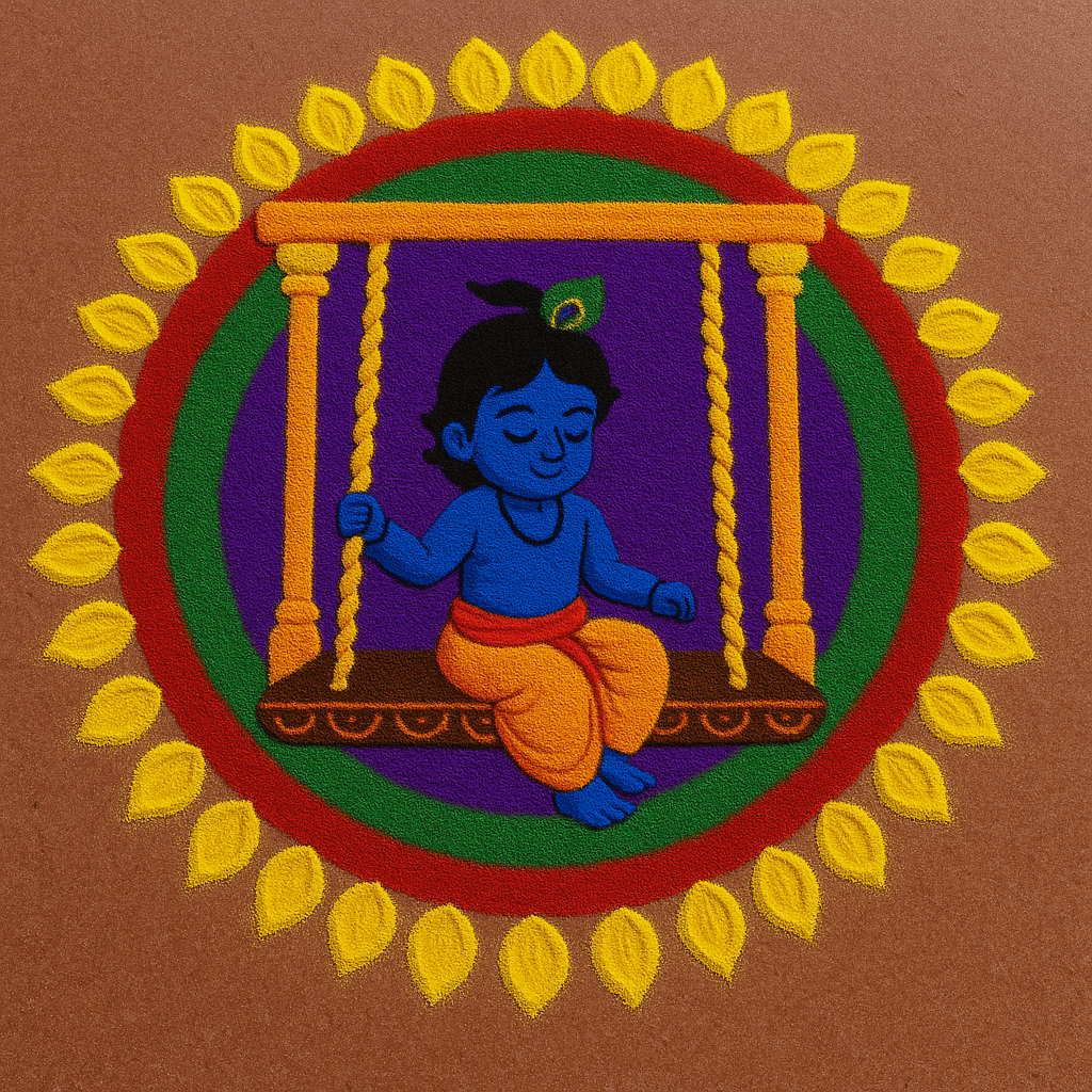 छोटे कृष्ण को झूले पर बैठे दिखाने वाली रंगोली डिजाइन बच्चों से लेकर बड़ों तक हर किसी को पसंद आती है. क्योंकि इसमें हल्के और गहरे रंगों का कॉन्ट्रास्ट बहुत अच्छा प्रभाव डालता है.
