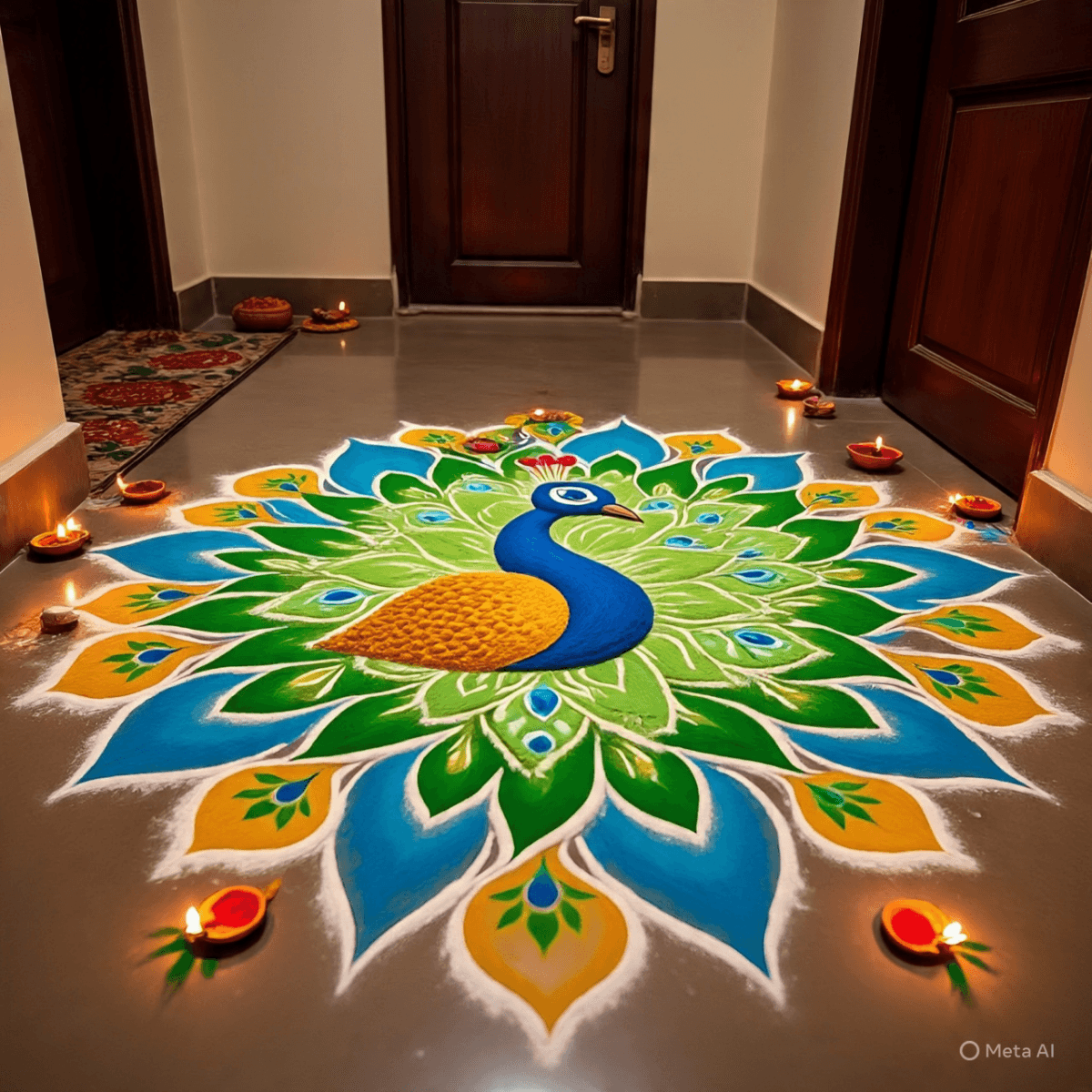 मोर पंख भगवान कृष्ण का अभिन्न हिस्सा है. नीले और हरे रंग से बनी मोर पंख वाली रंगोली देखने में बेहद खूबसूरत लगती है और त्योहार की शोभा बढ़ाती है.