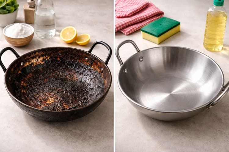 बेकिंग सोडा और डिश लिक्विड मिलाकर गाढ़ा पेस्ट बनाएं. रातभर लगा रहने दें. सुबह स्क्रब करें – कढ़ाई फिर से चमक उठेगी.