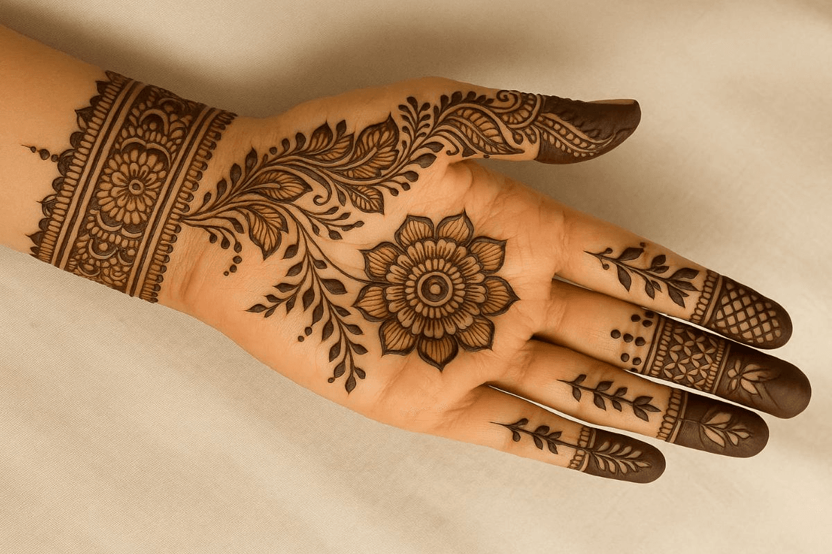 इस तरह की मेहंदी डिजाइन उन लोगों को काफी पसंद आयेगी जिन्हें न तो पूरी हाथ भरकर मेहंदी लगाना है न ही सिंपल. ये डिजाइन इन दिनों लोगों को काफी पसंद आता है.