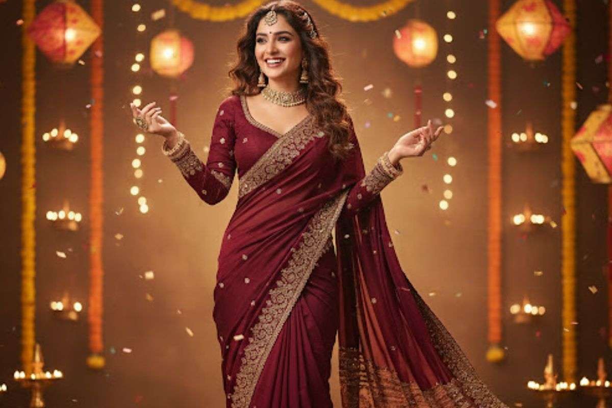 करवा चौथ पर गोल्डन साड़ी पहनकर आप एक एलिगेंट लुक पा सकती हैं. आप इसके लिए वर्क वाली साड़ी को पहनें.