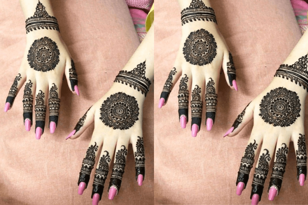 सर्कल-पाम डिजाइन (Circle Palm Design), जैसा कि नाम से ही स्पष्ट है, हथेली के केंद्र में एक बड़ा सर्कल होता है, जिसे बारीकी से डिजाइन किया जाता है. यह डिजाइन पारंपरिकता और आधुनिकता का अनूठा मिश्रण है. हथेली के बीच में बना सर्कल किसी फूल, मंडला या ज्यामितीय आकार में होता है, जिसे चारों तरफ जालीनुमा या पैटर्न वाले डिजाइनों से घेरा जाता है. यह न केवल देखने में आकर्षक होता है, बल्कि हाथों की सुंदरता को भी बढ़ाता है.