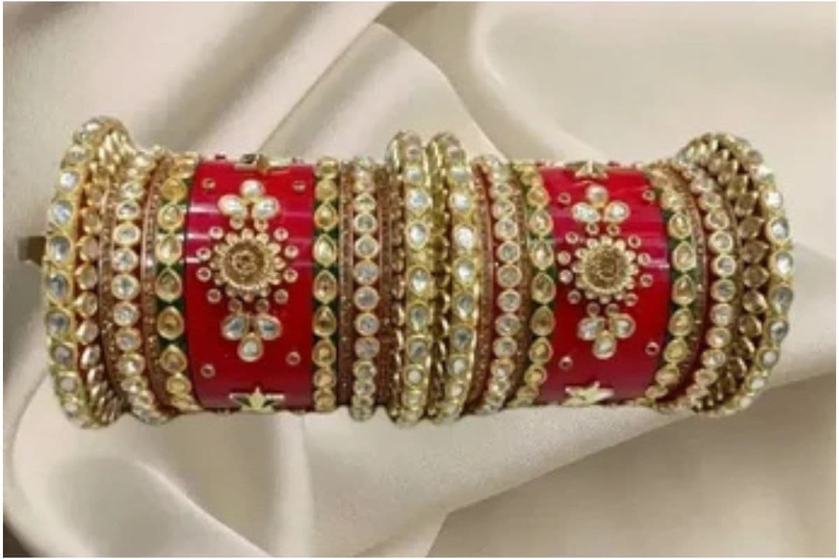 यह चूड़ी सेट पारंपरिक राजस्थानी डिजाइन में है जिसमें कुंदन और पोल्की स्टोन का सुंदर संयोजन है.जाे आपके लुक को परफेक्ट बनाता है .