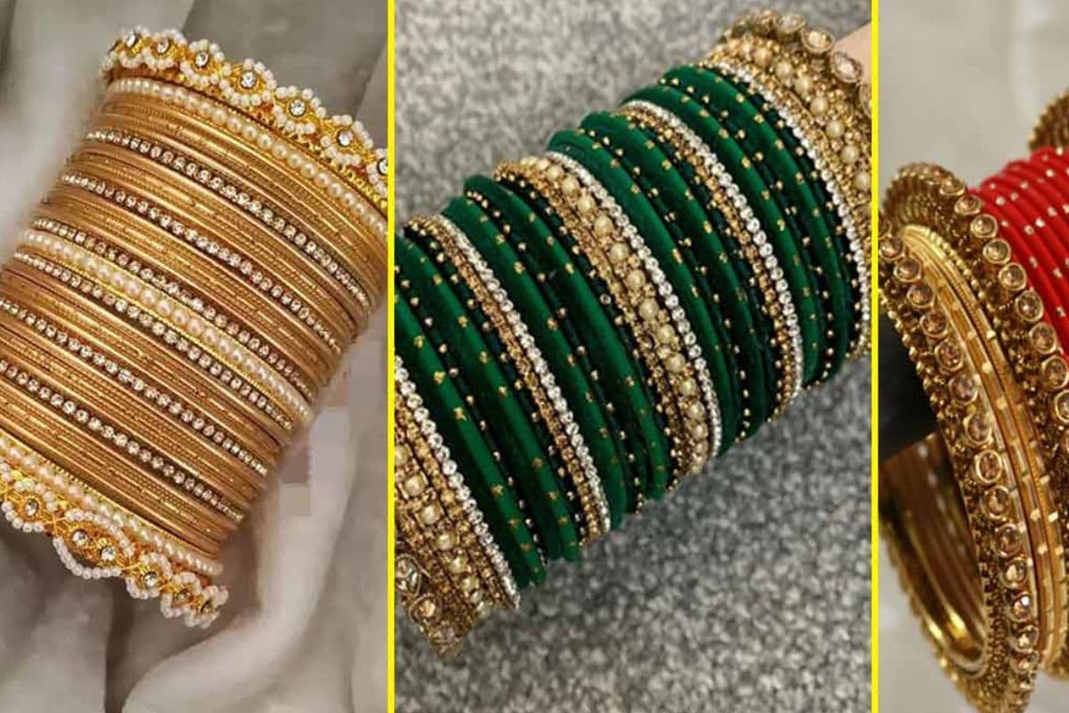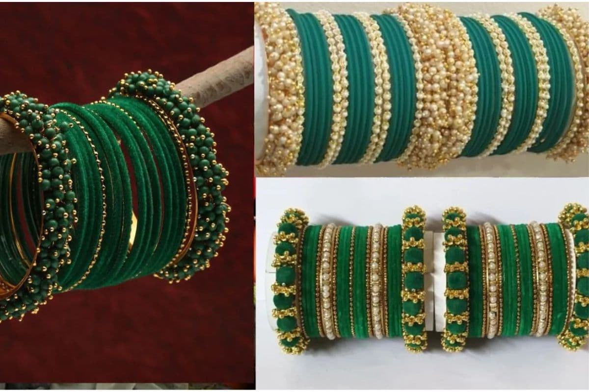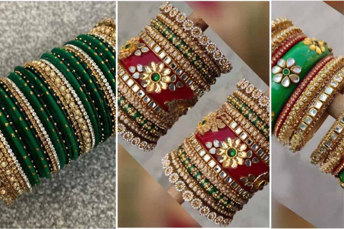 चूड़ी सेट विद कुंदन या स्टोन वर्क: इन चूड़ियों में कुंदन, मोती या छोटे स्टोन लगे होते हैं जो इन्हें एक रॉयल लुक देते हैं. शादी, तीज या किसी फेस्टिव मौके पर ये बहुत सुंदर लगती हैं.