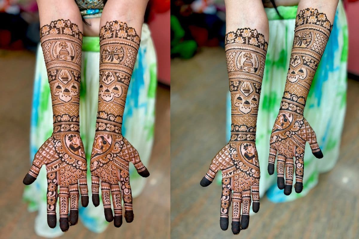 अपनी खूबसूरत दुल्हन को रॉयल और ट्रेडिशनल लुक एक साथ देने के लिए आप इस मेहंदी डिजाइन को हाथों पर जरूर सजाएं. यह मेहंदी शादी की यादों को और भी खास बना देती है.