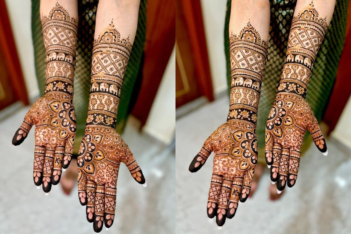 एलिफेंट फुल हैंड ब्राइडल मेहंदी डिजाइन शाही और पारंपरिक टच के साथ दुल्हन के लिए परफेक्ट ऑप्शन है, जो हर शादी में खास बन जाता है. अगर आप अपनी शादी में कुछ अलग और रॉयल दिखना चाहती हैं, तो यह डिजाइन आपके लिए एक बेहतरीन ऑप्शन है.