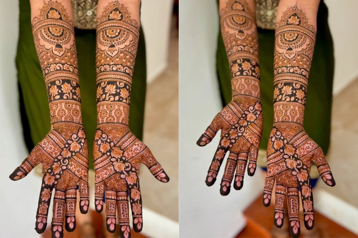 फ्लोरल फुल हैंड ब्राइडल मेहंदी डिजाइन एक ऐसा मेहंदी स्टाइल है, जो दुल्हन के हाथों को और सुंदर बना देता है. इसमें तरह-तरह के फूलों के डिजाइन और बारीक जाल जैसी आकृतियां बनाई जाती हैं, जो हाथों को पूरा भर देती हैं और बहुत अच्छा लुक देती हैं.