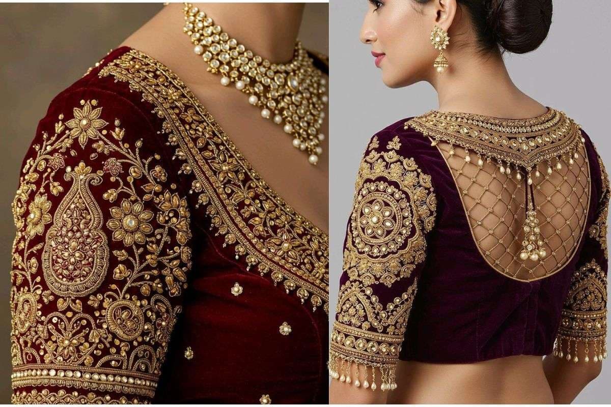 राजवाड़ी कफ डिजाइन (Statement Cuffs): अगर आप रॉयल लुक चाहती हैं तो कफ वाले फुल स्लीव ब्लाउज बेहतरीन हैं. इसमें कलाई के पास चौड़ा बॉर्डर या हैवी एम्ब्रॉयडरी होती है जो पुराने जमाने के शाही लिबास की याद दिलाती है.सिल्क या बनारसी साड़ी के साथ इसे पहनने पर आपको किसी भारी ज्वेलरी की जरूरत नहीं पड़ेगी.