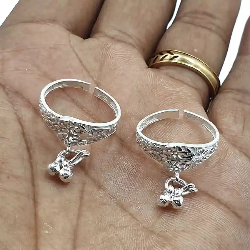 सिंगल बैंड घुंघरू बिछिया सिंपल डिजाइन जिसमें एक पतला चांदी या ऑक्सिडाइज्ड मेटल का बैंड होता है.नीचे छोटे घुंघरू जुड़े होते हैं जो चलते समय मधुर खनक देते हैं. डेली वियर के लिए परफेक्ट है.