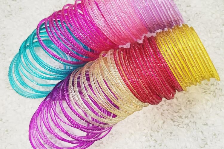 अंदर लगी गोल्ड फ़ॉइल वाली साफ़ या टिंटेड चूड़ियाँ – परंपरा और चमक का मिश्रण.