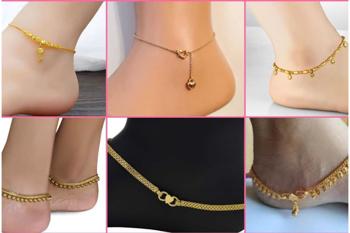 मिनिमलिस्ट गोल्ड एंकलेट्स : पतली चेन वाली पायलें जिनमें एक छोटा सा आकर्षण होता है. ये सिंगल चेन या डबल चेन में आती हैं. बिना घुंघरू के सिंपल चेन डिजाइन भी काफी पसंद किए जा रहे हैं.कैजुअल आउटफिट्स, स्किनी जीन्स, शॉर्ट ड्रेसेस या यहां तक कि सिंपल कॉटन साड़ियों के साथ पहनें.