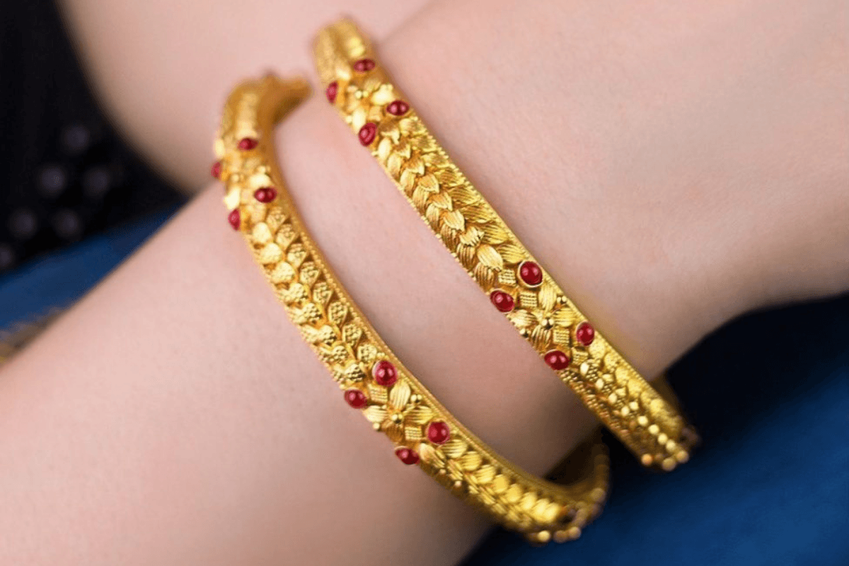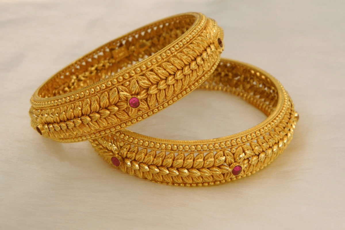 बेटी को देने के लिए गोल्ड के ये बैंगल डिजाइन बेस्ट हैं. इसमें गोल्ड के छोटे-छोटे पत्ते के डिजाइन बनाये हुए हैं और साथ ही गुलाबी रंग के स्टोन इसकी खूबसूरती को और बढ़ा रहे हैं.