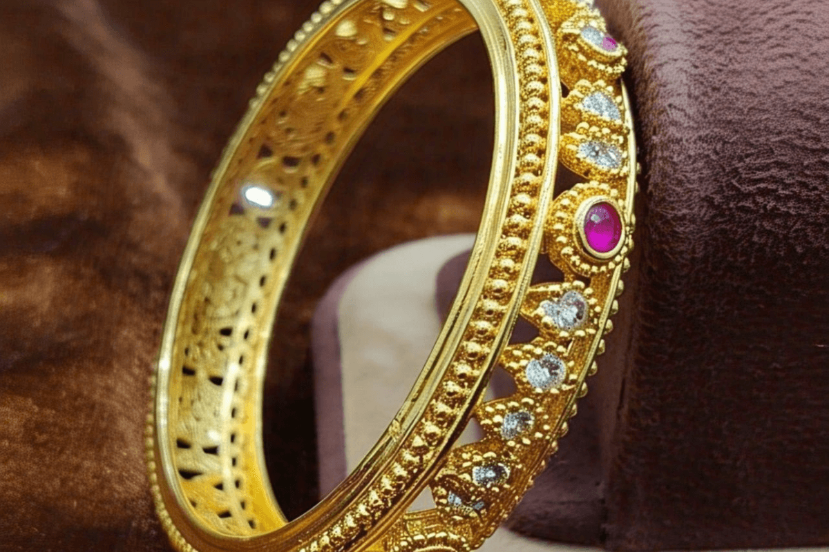 जटिल फिलिग्री पैटर्न और चमकते हुए रत्नों के संयोजन से बना यह बैंगल बहुत खूबसूरत लग रहा है. इसके बारीक डिजाइन इसकी खूबसूरती दोगुनी कर रहे हैं.